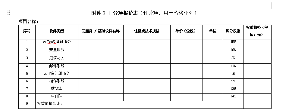 对于“IM电竞有限公司云资源服务供应商谈判比选公告”中的“附件2-1 分项报价表(评分项,用于价格评分)”