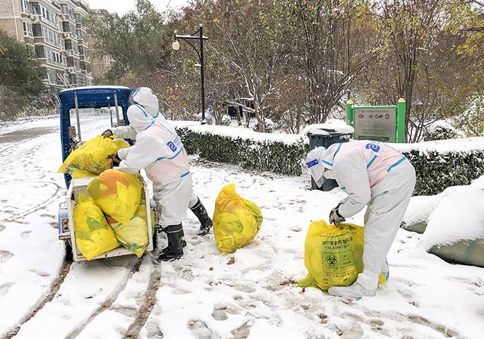 范吉庆说,由于总是弯腰,他和同事们经常腰酸背痛,但看到一箱箱打包好的涉疫医疗垃圾被集团所属固废物流公司医废中心的专业车辆安全带离,感到特别高兴。记忆最深的是11月6日晚,突降大雪,第二天早晨居民们还要下楼做核酸检测。“为了让居民们下楼时不会滑到,我们连夜投入到融雪作业中,那次我们在小区一直干到了第二天凌晨3点。”