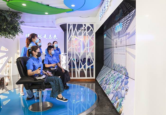 中厅分为四个展示区域,分别是“认识生活垃圾”“生活垃圾焚烧发电”“阿苏卫的社会价值”“城市因我更美丽”。参观人员通过短片介绍和数据对比,直观地掌握了各种垃圾处理技术的优缺点,深刻认识到垃圾分类工作的紧迫性和必要性。在VR游戏互动区,大家戴上VR眼镜、站上3D站台,沉浸式地进行了垃圾焚烧处理全流程的体验,“看”到了焚烧工艺运行的真实样貌。
