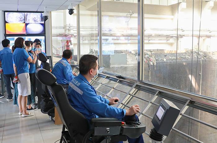 最后,参观人员来到垃圾吊操作室,观看垃圾吊从35米深的垃圾储坑抓取垃圾,投入料仓的过程。