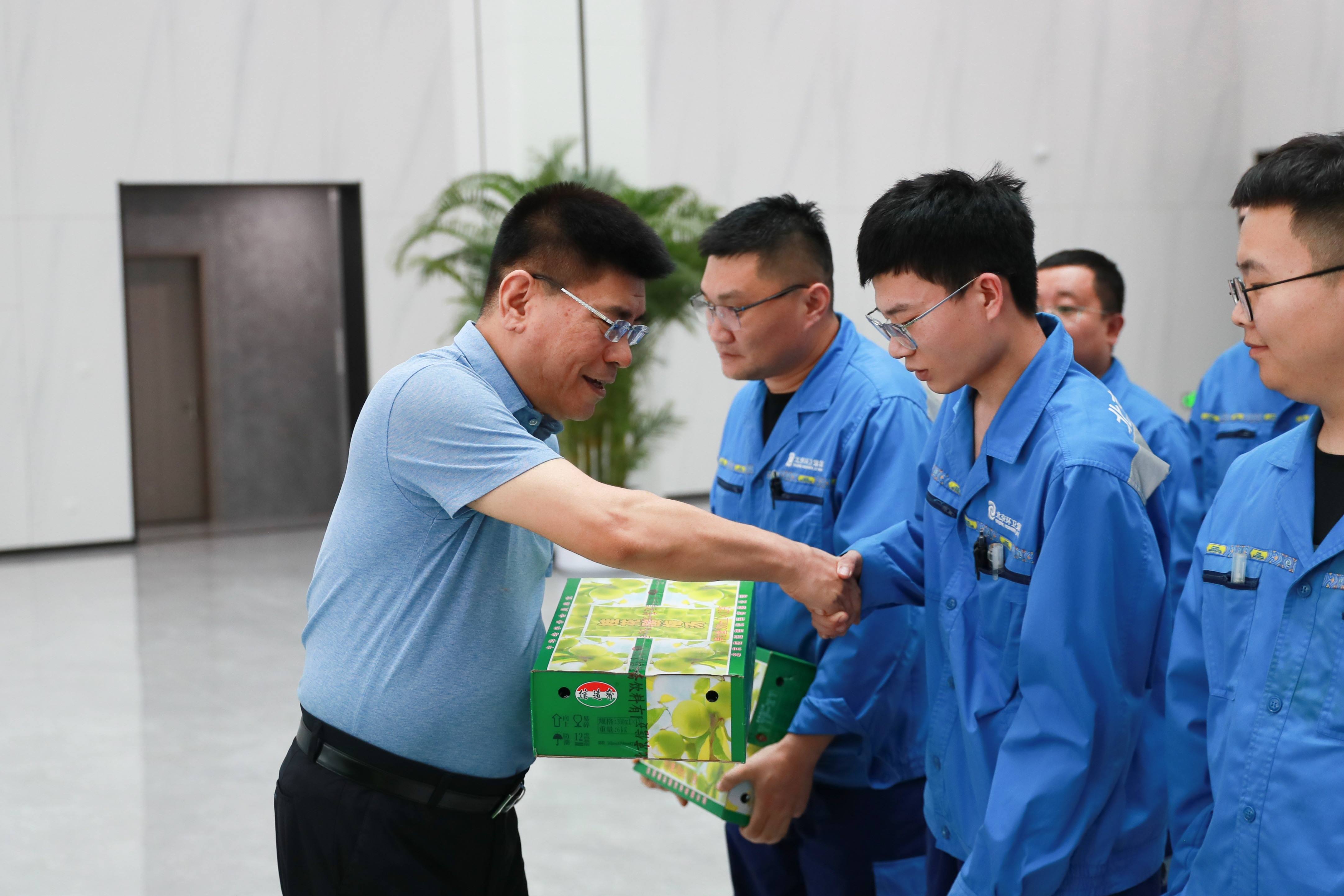 金善文同志向在夏日高温情况下坚守在岗位一线的广大环卫职工致以诚挚的问候。他表示,安定循环经济园区环境干净整洁,非常现代化。这座大型环卫设施的建设和投运离不开广大IM电竞人的辛勤付出,大家辛苦了。金善文同志向现场的环卫职工代表送上饮料、矿泉水等防暑降温物品,叮嘱大家提高自我防护意识,做好劳动保护工作。