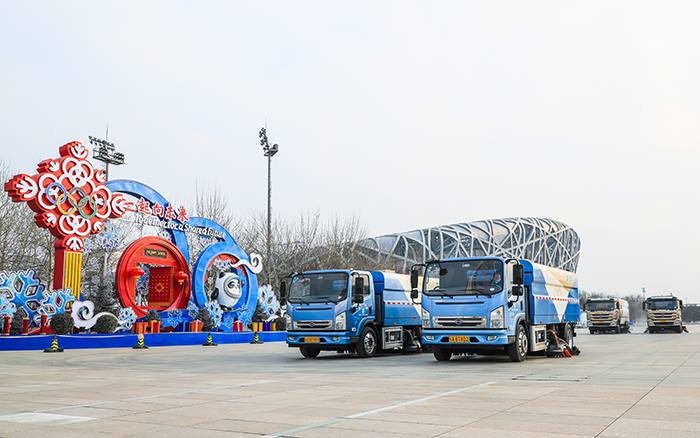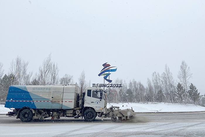 冬奥会期间,集团所属北京机扫公司奥园环境服务中心职工驾驶纯电动环卫车在景观大道作业