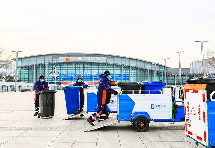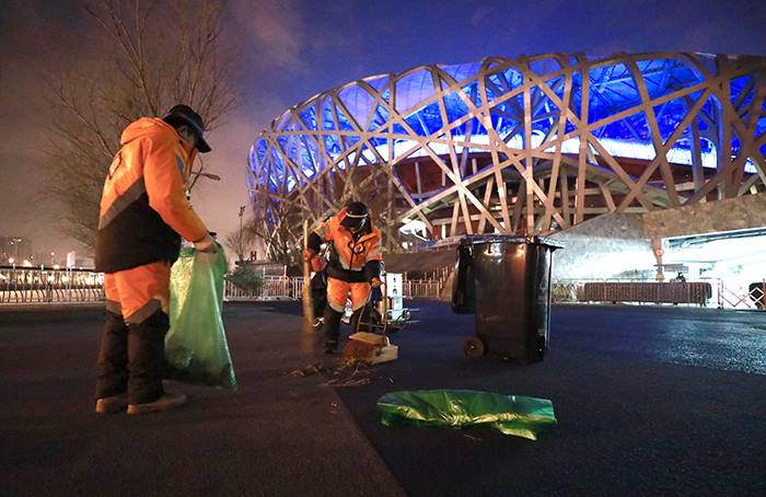 集团职工正在国家体育馆周边区域进行垃圾清运作业