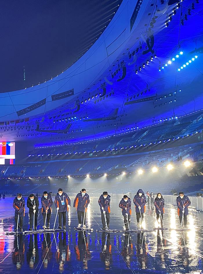 1月30日,冬奥会开幕式进行全要素彩排,集团职工在国家体育场内进行应急保障作业(北京机扫公司供图)