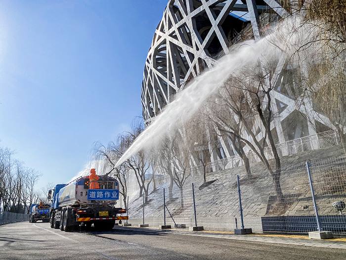 2月3日,冬奥会开幕式前一天,集团职工在国家体育场周边进行湿化作业