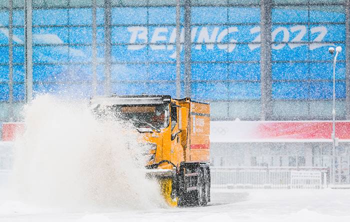 2月13日,北京迎来强降雪,集团职工驾驶多功能除雪车在延庆赛区进行扫雪铲冰应急保障作业(丁丹 摄)