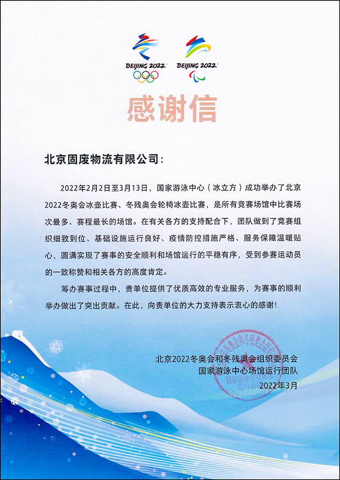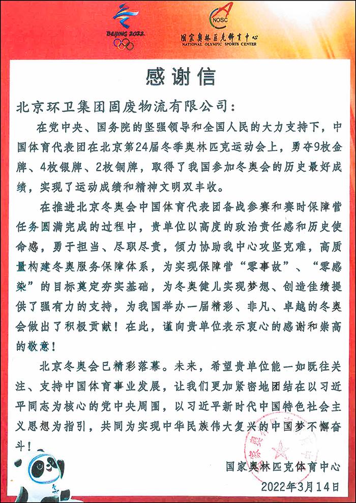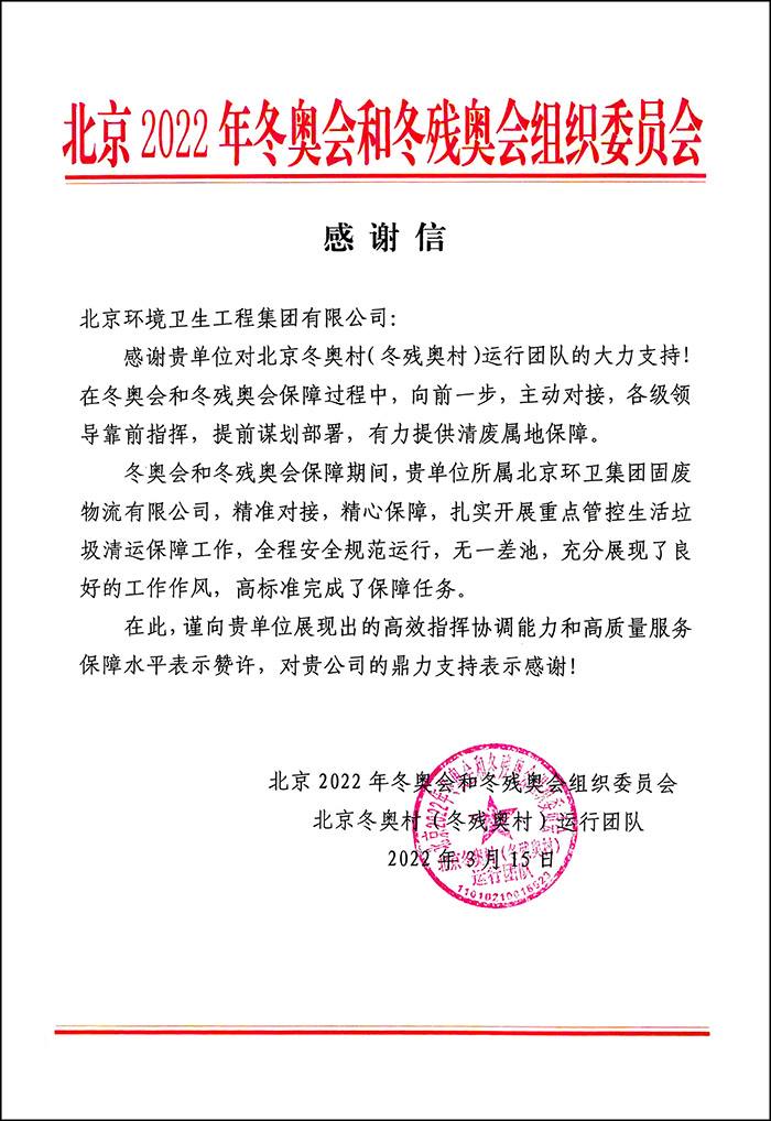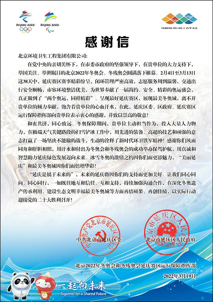 近日,延庆区委区政府、北京冬奥村(冬残奥村)运行团队、国家体育馆场馆运行团队、国家速滑馆场馆运行团队、国家游泳中心场馆运行团队、国家奥林匹克体育中心、北京冬奥会兴奋剂检测中心运行团队、北京北控京奥建设有限公司、张家口物流安检场等单位纷纷发来感谢信,感谢集团及所属单位为冬奥会和冬残奥会的顺利举办所作出的突出贡献!