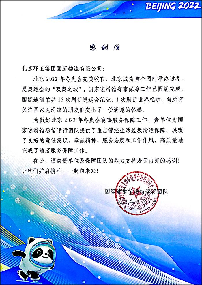 国家速滑馆场馆运行团队感谢信