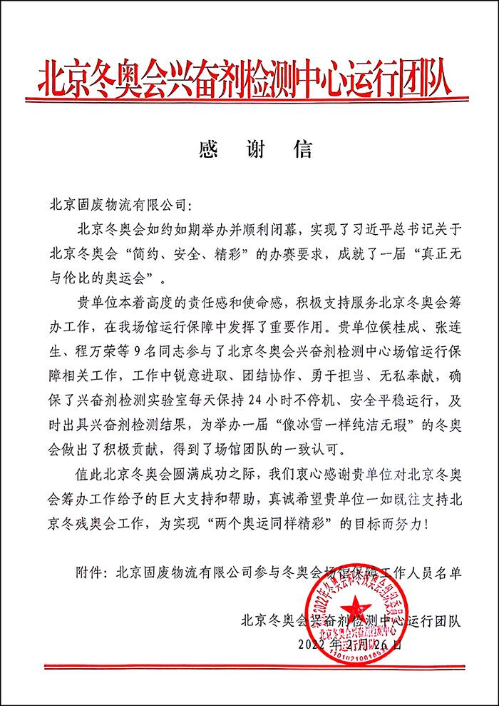 北京冬奥会兴奋剂检测中心运行团队感谢信