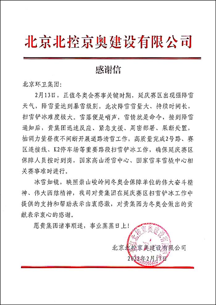 北京北控京奥建设有限公司感谢信