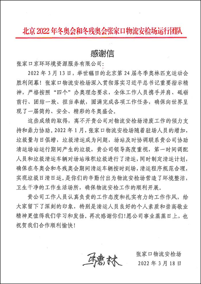 张家口物流安检场感谢信